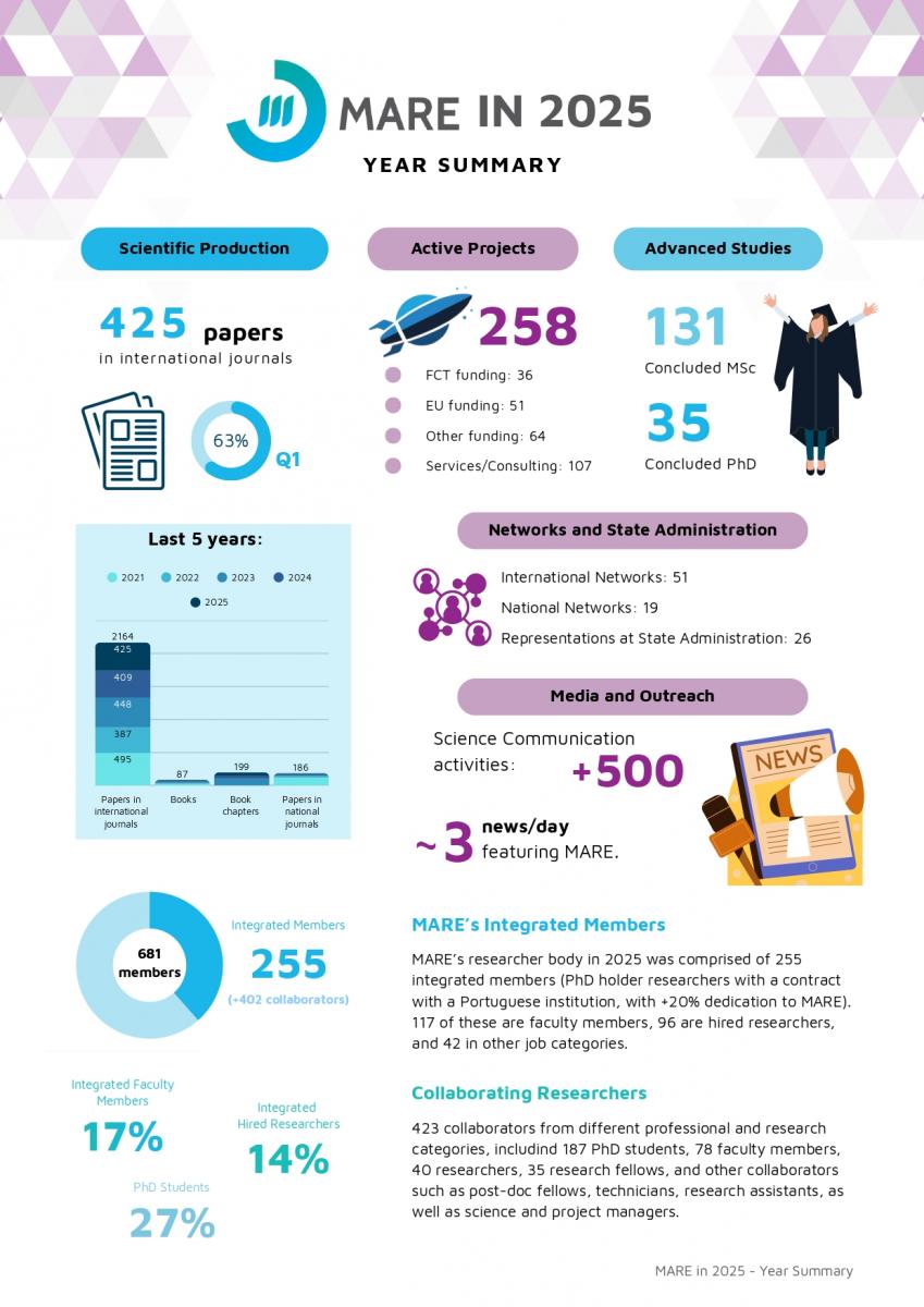 Em 2025, o MARE reforçou o seu papel nas ciências aquáticas, enquanto consolidou o seu contributo para a sociedade, para as políticas públicas e para a sustentabilidade. Com 425 publicações científicas, 258 projetos em curso e mais de 500 ações de comunicação de ciência, o centro continua a transformar conhecimento em impacto real.