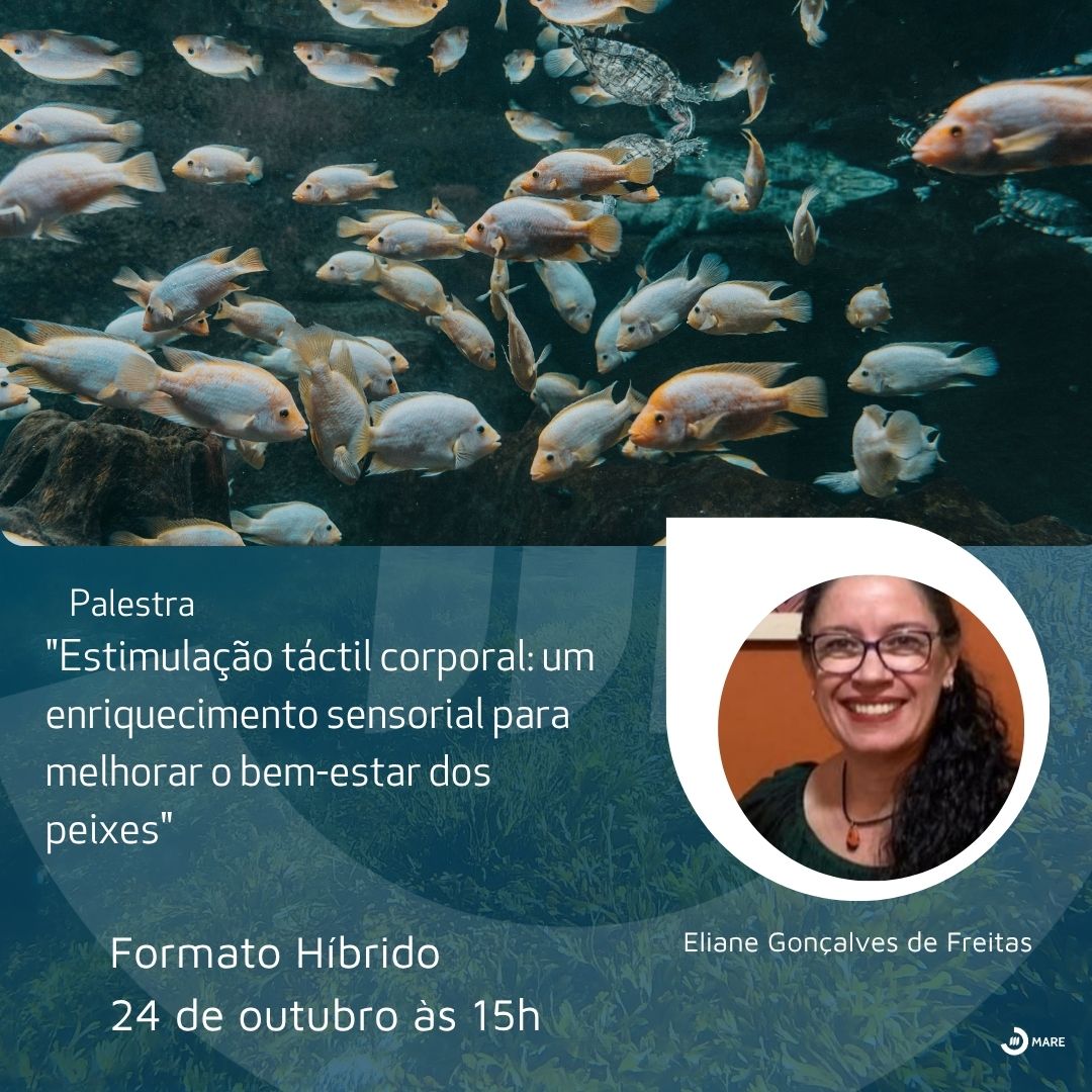 O MARE – Centro de Ciências do Mar e do Ambiente convida toda a comunidade académica e científica a assistir à palestra "Estimulação táctil corporal: um enriquecimento sensorial para melhorar o bem-estar dos peixes", apresentada por Eliane Gonçalves de Freitas, Professora Associada em Comportamento Animal no Departamento de Ciências Biológicas e no Centro de Aquicultura da UNESP – Universidade Estadual Paulista Júlio de Mesquita Filho (São José do Rio Preto, SP, Brasil).