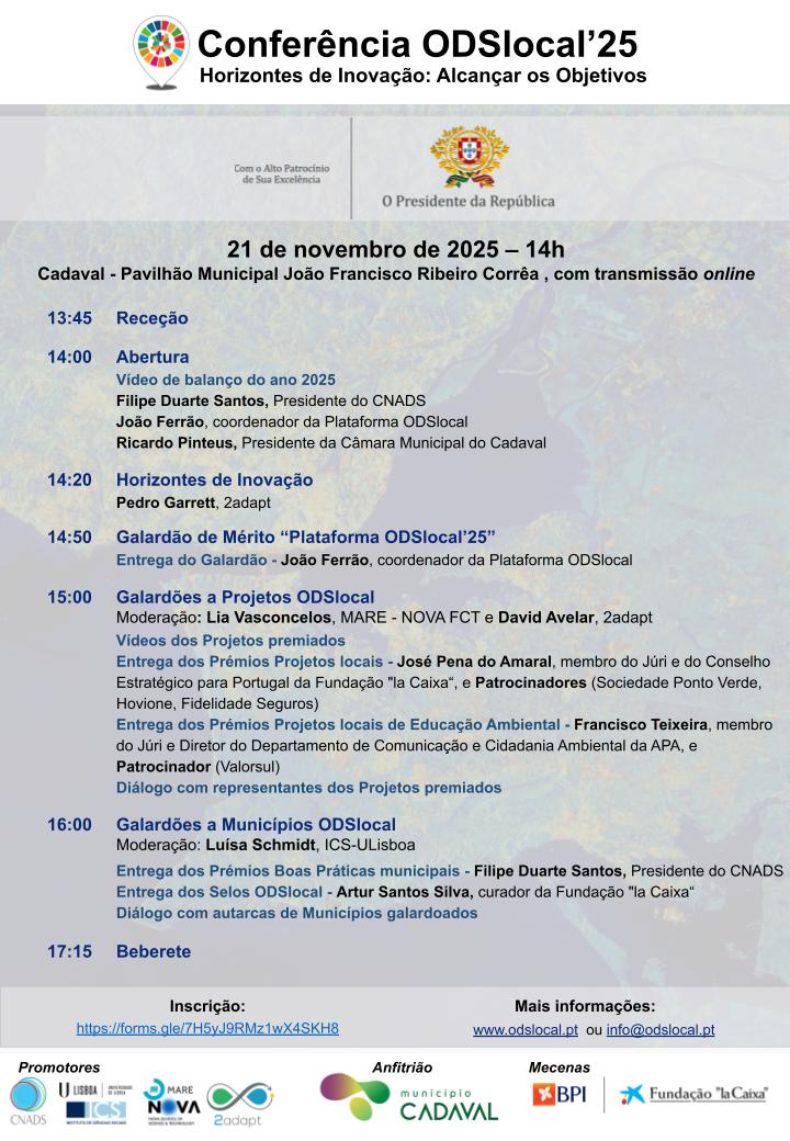 No próximo dia 21 de novembro, a partir das 14h00, realiza-se a 6.ª Conferência da Plataforma ODSlocal, sob o lema "Horizontes de Inovação: Alcançar os Objetivos", no Pavilhão Municipal João Francisco Ribeiro Corrêa, no Cadaval.